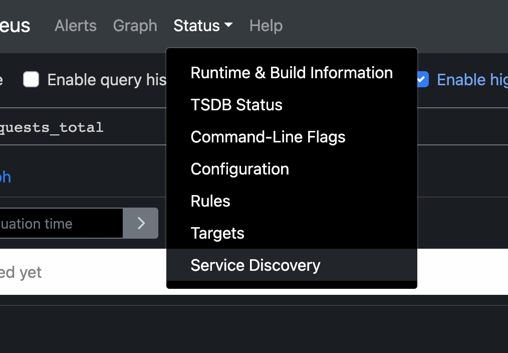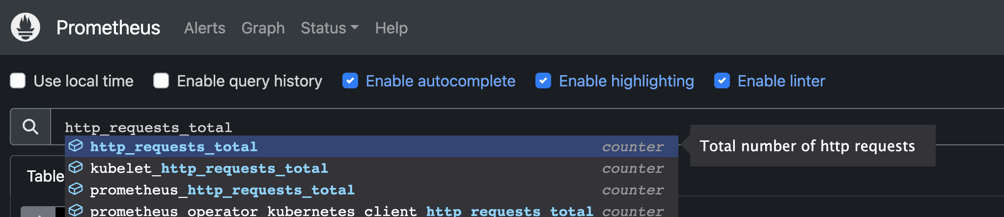 Open the Prometheus UI and you’ll be able to se the http_request_total parameter now which was not available earlier. It is neccesary to hit the application to get the parameter in prometheus UI.